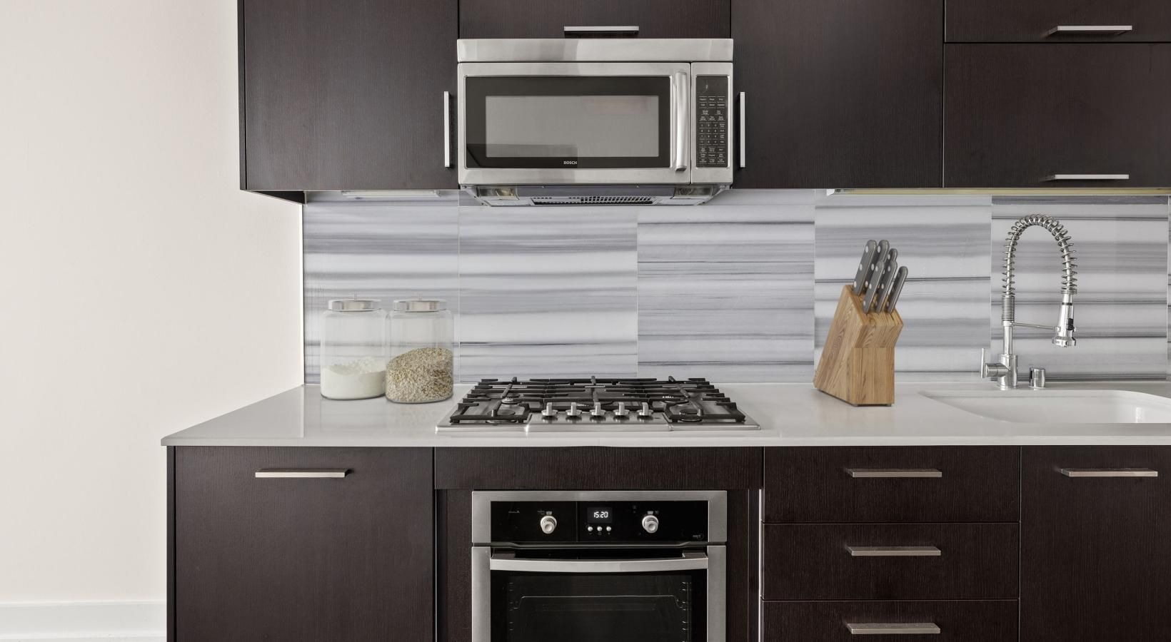 • a kitchen with black cabinets