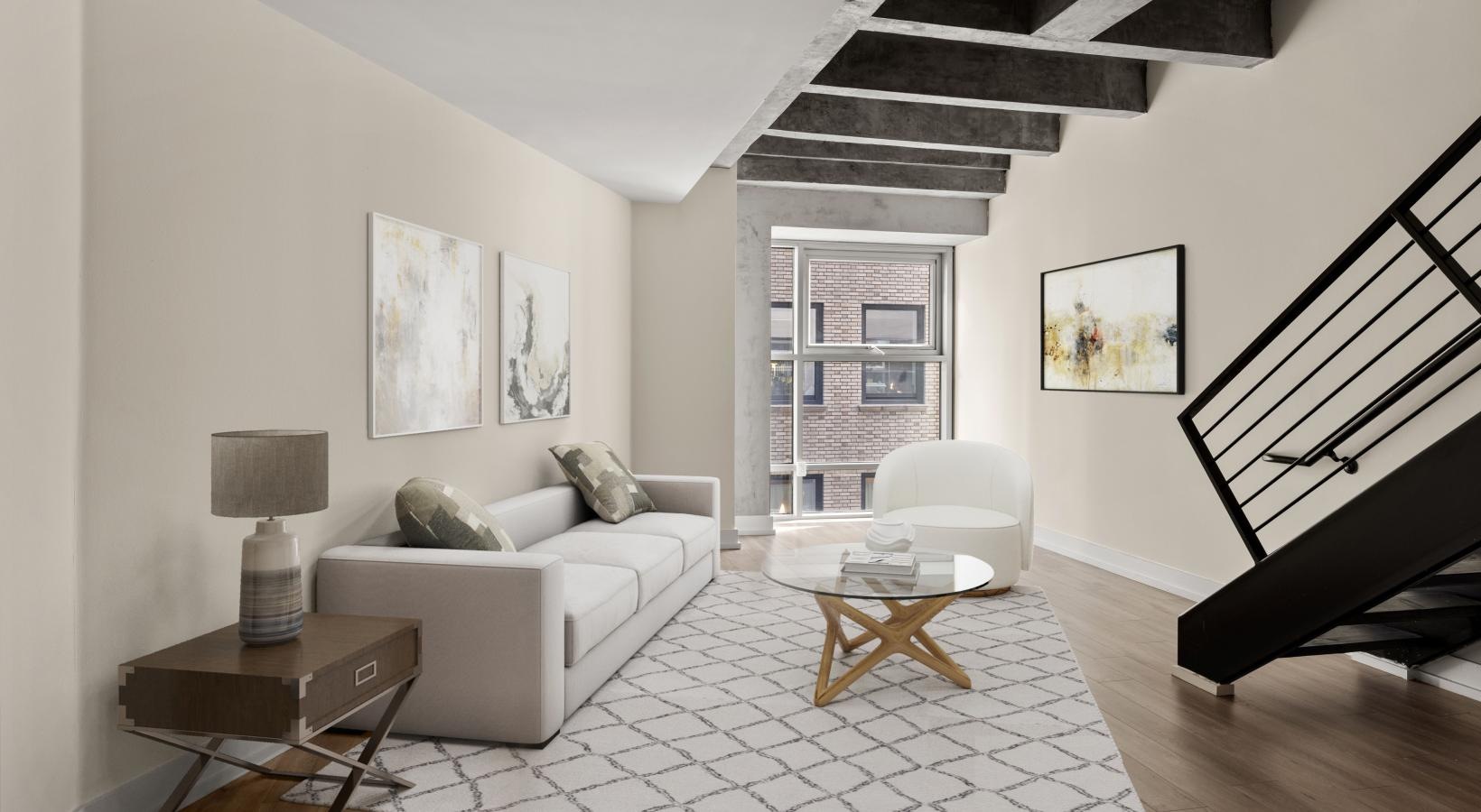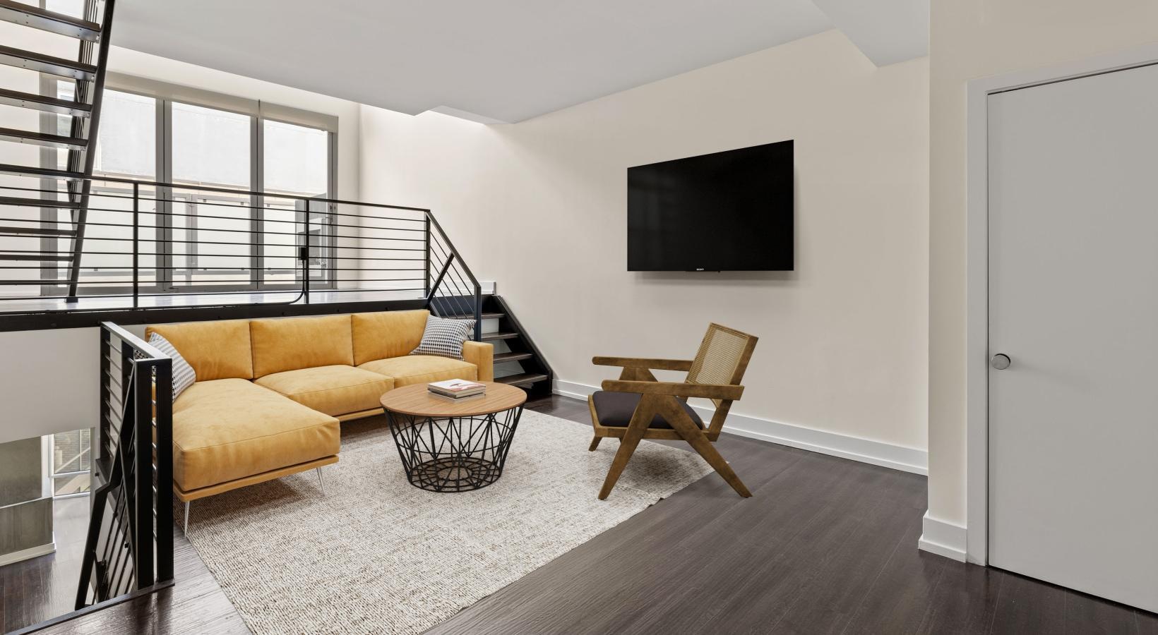 • a living room with a stair and a couch