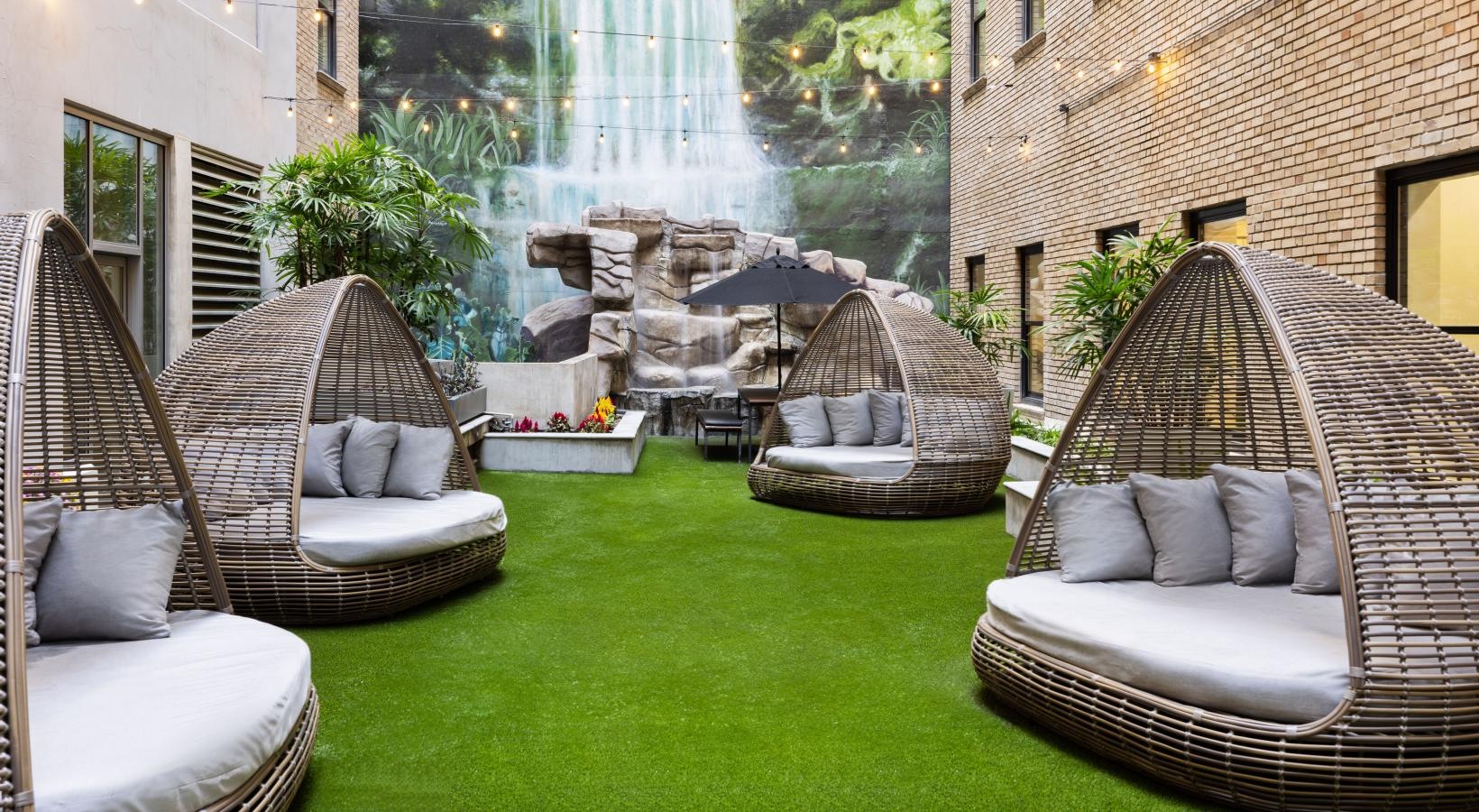 • a courtyard with chairs and pods